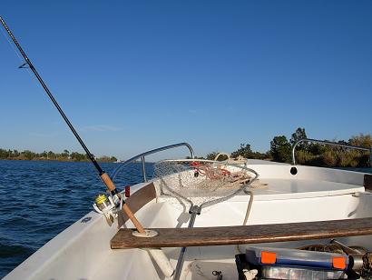 A bord d'un petit bateau de 5 m, équipé d'un moteur thermique de 13,5 chevaux, nous rechercherons ces différentes espèces, dans le Delta et non en mer, en variant les plaisirs qu'offre la traîne, le vif et la calée, sur des postes très variés.